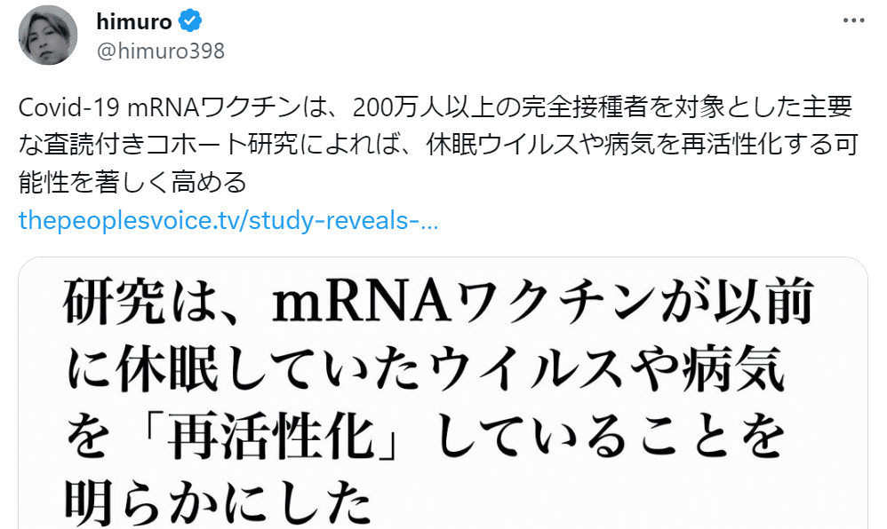 himuroは2025年2月時点、X(twitter)フォロワー数が18.6万という多さを誇っていた。小まめに陰謀論ネタをポストしたりリポストしているのでフォロワーが多いのだが、陰謀論者としてのオリジナリティはゼロ。陰謀論者ウォッチャーとしてはアクビが出るようなつまらない陰謀論ツイッタラーである。